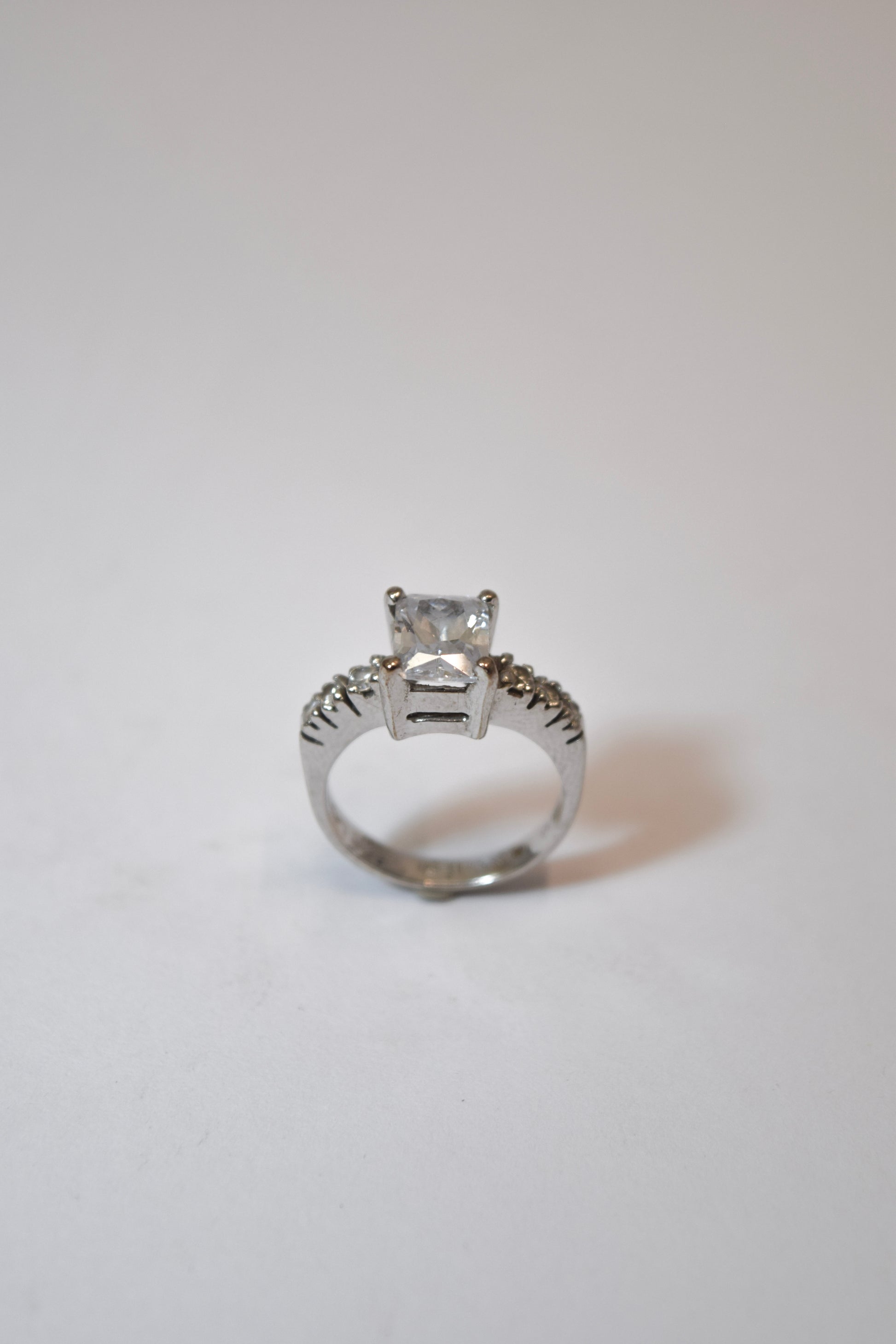 Este elegante anillo de oro blanco de 18 quilates luce una impactante piedra blanca cuadrada en el centro, complementada con piedras blancas más pequeñas a cada lado. Su diseño realza la refinada artesanía y la sofisticación, convirtiéndolo en una opción exquisita para quienes buscan un lujo atemporal y un brillo sutil. Ideal para ocasiones especiales o como pieza destacada, este anillo combina durabilidad con elegancia clásica.