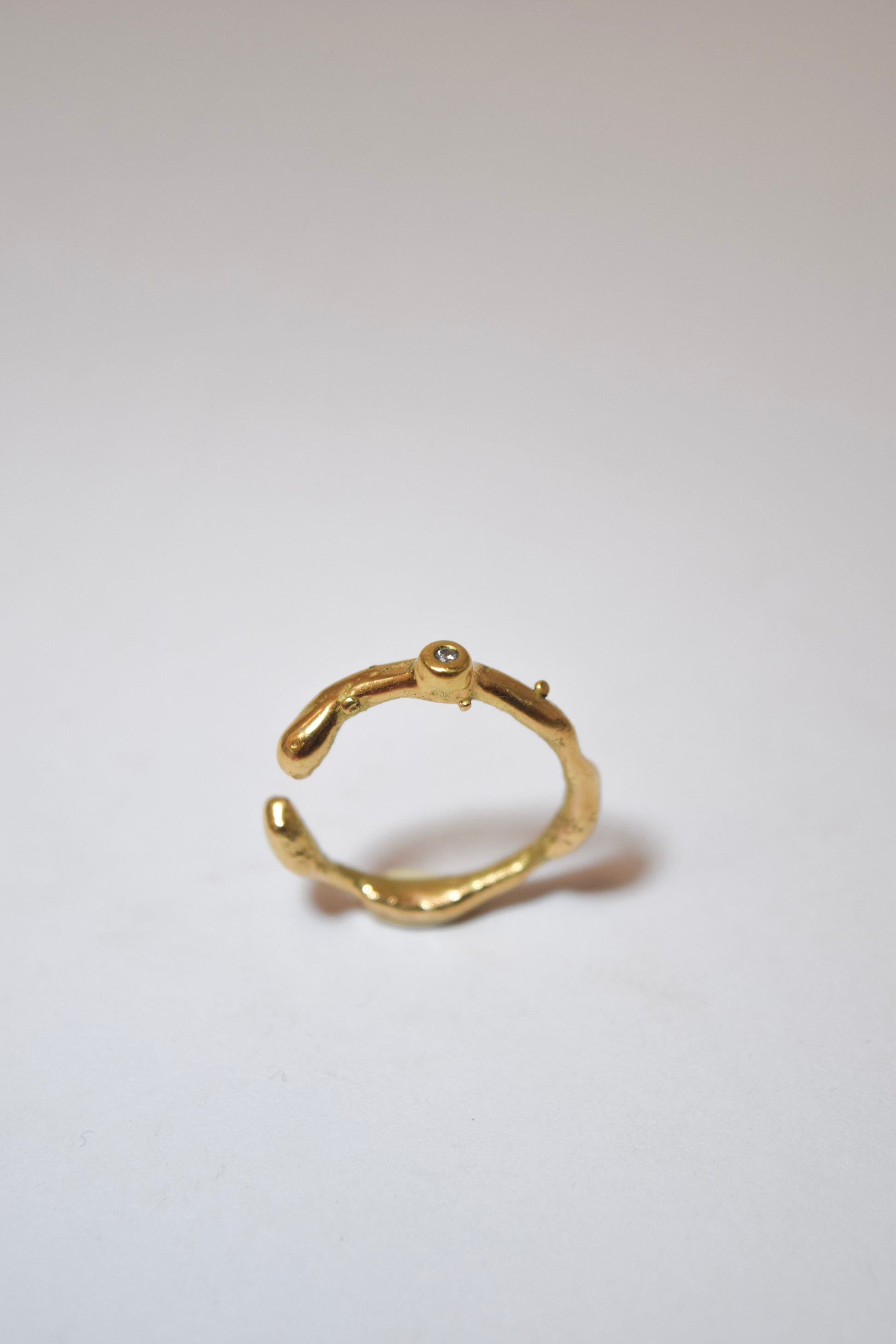 This exquisite 18k gold ring features a distinctive lava inspired design, showcasing a sparkling diamond that enhances its natural, textured form. Crafted with expert precision, the ring balances organic artistry with refined luxury, making it a statement piece that complements both modern and classic styles. Its unique shape and brilliant diamond accent ensure enduring elegance and timeless appeal.
