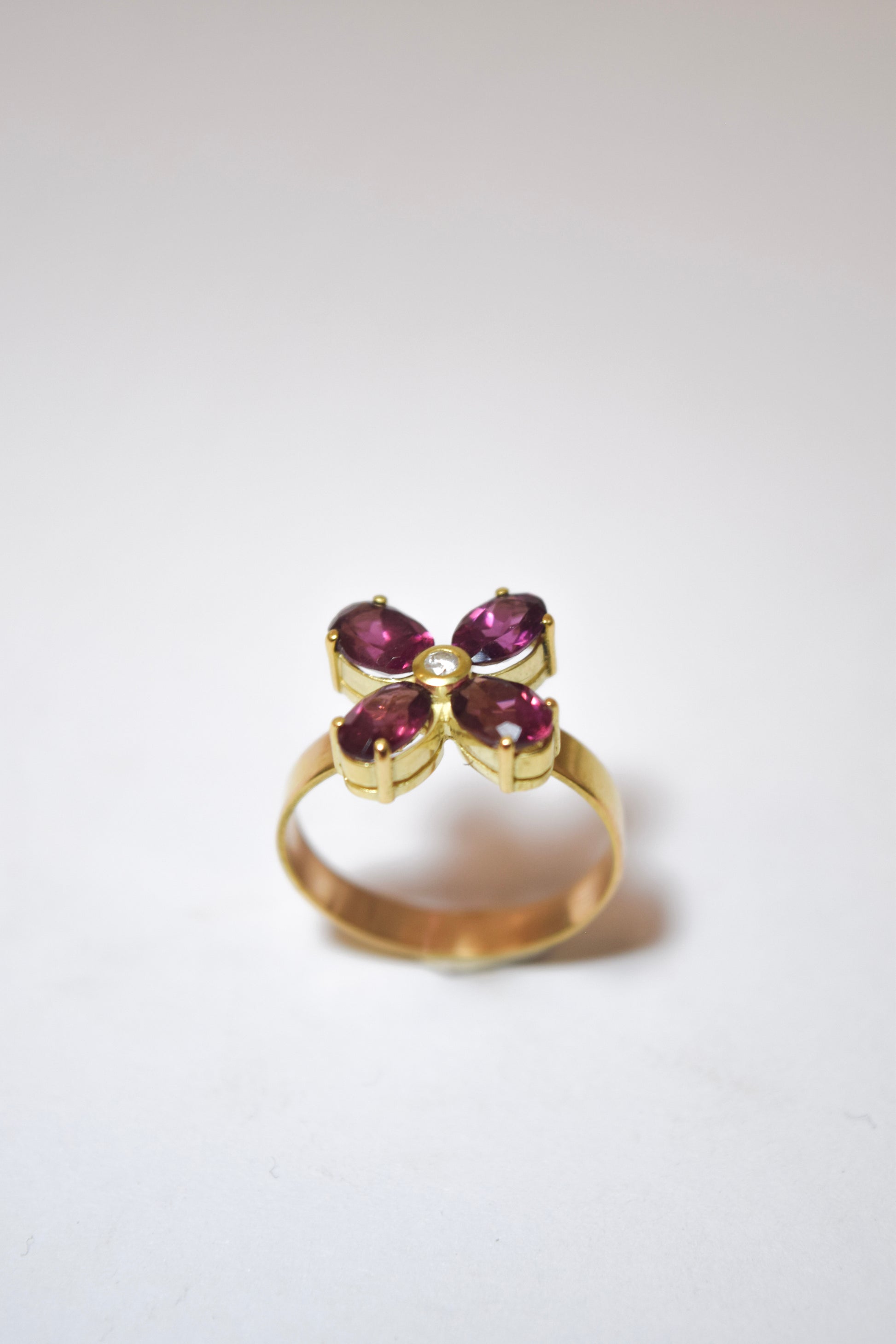 Crafted in 18k gold, this exquisite flower shaped ring features a luminous diamond at its center, surrounded by vibrant tourmalines. The combination of precious stones highlights the intricate design, offering a sophisticated balance of brilliance and color. Perfect for collectors who value both fine craftsmanship and unique elegance in their jewelry.