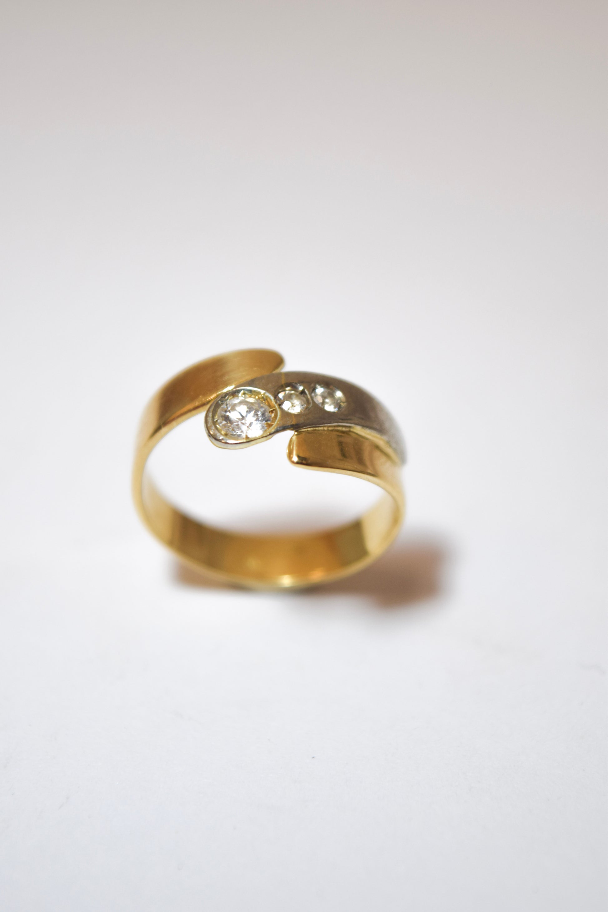 This exquisite ring features an 18k yellow gold band accentuated by a distinctive white gold center strip. It is elegantly adorned with three uniquely shaped diamonds, each carefully selected to highlight their individual brilliance and complement the sophisticated design. A refined choice for those seeking a harmonious blend of classic craftsmanship and modern luxury.