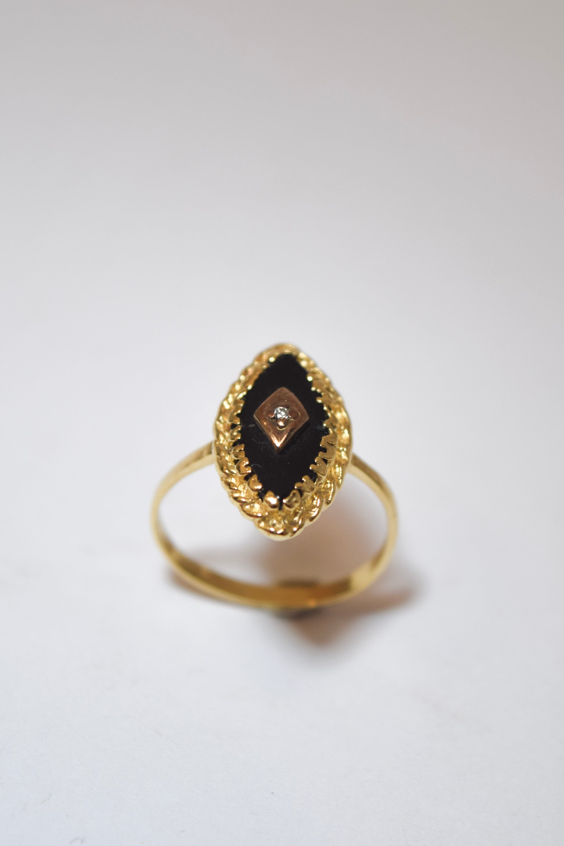 This expertly crafted 18k yellow gold ring features a classic vintage design, centering a deep black onyx stone crowned with a radiant diamond. Its timeless style and exceptional materials make it an elegant addition for those appreciating refined heritage jewelry.