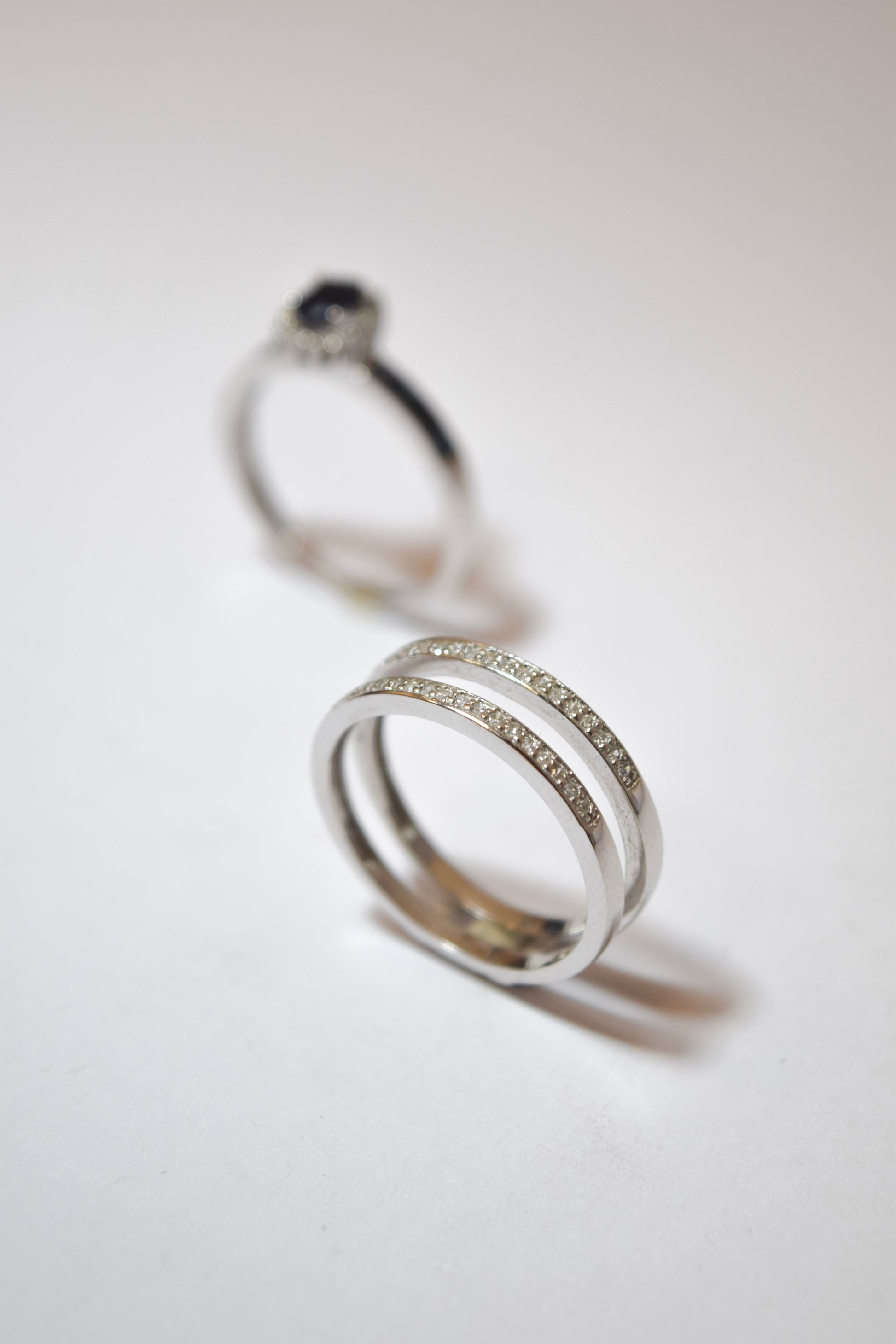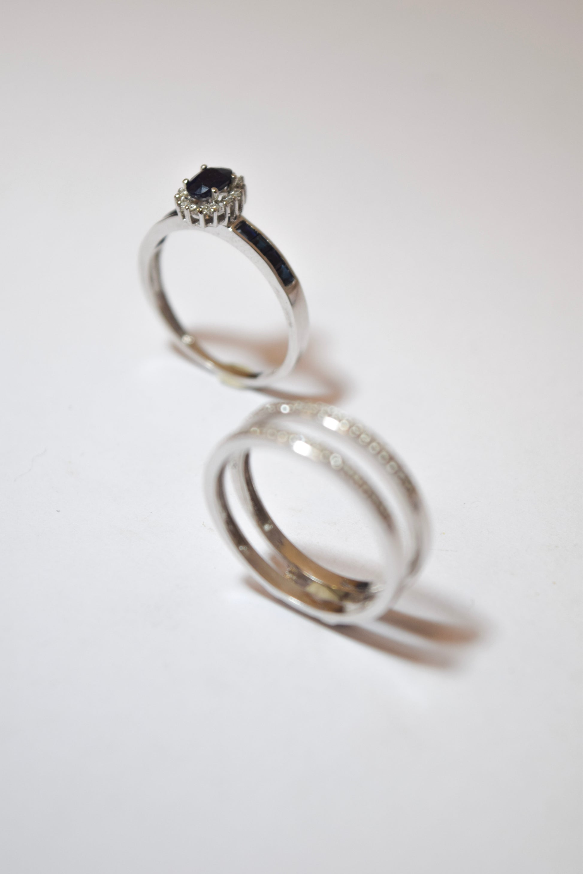 This elegant 18k white gold ring showcases a stunning center sapphire, surrounded by brilliant diamonds, with additional diamonds accentuating the sides. Designed for versatility, it can be worn as a single statement piece or combined. Perfect for those who appreciate fine craftsmanship and timeless luxury.